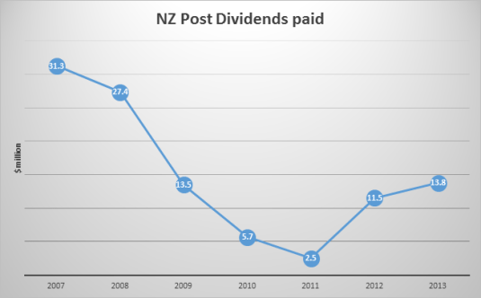 New Zealand Post is slowly going out the door with declining dividends to taxpayers, a sustained decline in its commercial valuation and a negative or poor Total Shareholder Return. Letter volumes declined by a one-half in 10 years but the parcels business is growing because of the rise of e-commerce and Internet shopping.