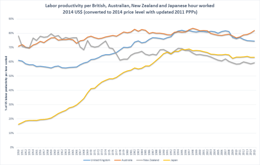Labour productivity per British, Australian, Japanese and New Zealand per hour worked (% USA since 1950, PPP)