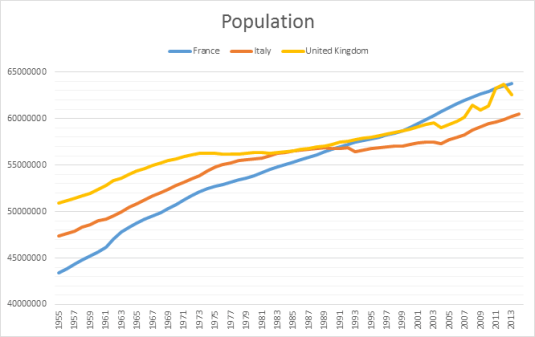 I have no information on why the British population was up and down so much in the last 10 years. Clearly the French have been doing well in terms of fertility despite reputation to the contrary. Italy is the country dropping the ball in terms of fertility.