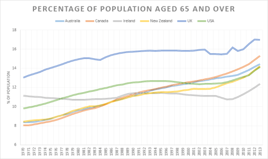 Population ageing seemed to have passed the Irish by until the Global Financial Crisis. The British (in dark blue) started older but really did not have much of an ageing until this squiggly behaviour in the last 10 years in their population data. Canada simply got older. There is a long pause in ageing in the USA but ageing started again apace in the last 10 years. Population ageing in Australia (in light blue) and New Zealand was pretty consistent over the entire period since 1970. Australians and New Zealanders simply got older.