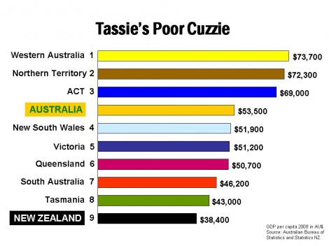 However it is going to be a tough ask to close the gap as the Australian economy has been thriving in the current economic climate with the RBA trying to suppress accelerating wage inflation. Below is a graph showing GDP per capita in AUS$ in 2008 – New Zealand is even below Tasmania.