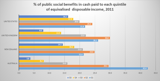 Australia does far better than any other country in targeting its welfare state to the bottom of the income distribution. Having an old age pension that is asset tested and income tested has a lot to do with that. New Zealand has an old age pension that is not income tested or asset tested. The USA has a contributory social insurance system that also ensures a considerable amount of its public social benefits are paid to the well off because they paid in Social Security taxes.