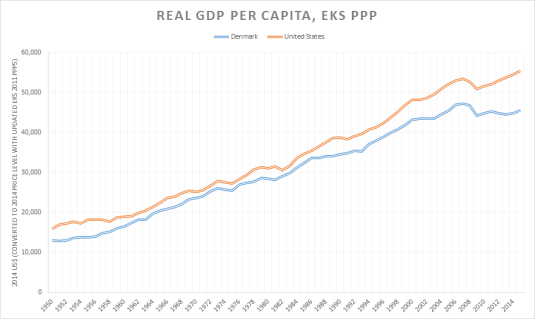 The USA is certainly richer than socialist Denmark in per capita GDP terms on a purchasing power parity basis. It always has been.