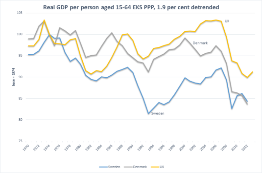 If you look at the performance of real GDP per working age person (PPP) detrended by the growth rate of the USA in the 20th century, which is 1.9%, the Danes had a bit of a poor run. In the chart below, a flat line means you are growing at the same rate to the USA; a rising line means growth in real GDP per working age person that is faster than the USA at that time; a fall in line means growth slower than the USA.