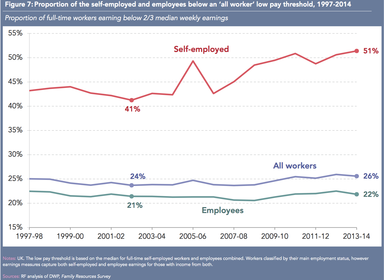 A couple of reports were published earlier this month containing more evidence of the collapse in self-employed earnings. The Resolution Foundation’s Low Pay Britain 2015 report found that over half the full-time self-employed are earning below two-thirds of median weekly earnings. The self-employed are way more likely to be among the low paid than those in employment.