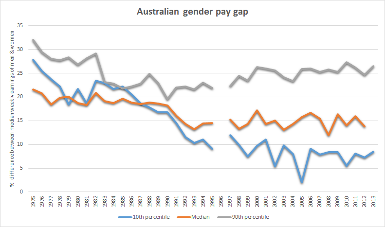 No gender equality down under – Australian gender pay gap at 10th, 50th and 90th percentile since 1975