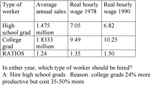Managers often say that their goal in hiring is to obtain the best quality workers. It sounds like a good idea, but is it? The most productive workers are also likely to be the most expensive. Should the goal instead be to hire the least expensive workers? …The best worker is not the cheapest, nor the most productive, but the one with the highest ratio of productivity to cost. We should hire as long as the marginal productivity of the last worker hired is greater than or equal to the cost of the worker.