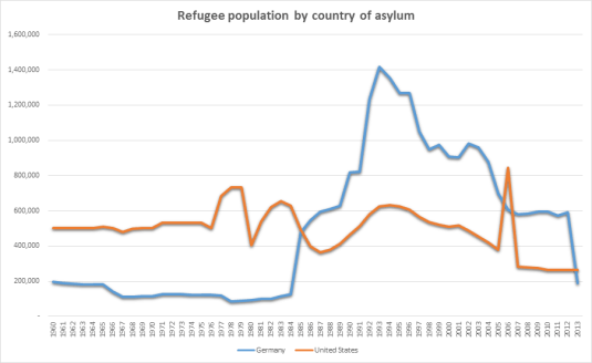 I had to use two charts because Germany hosted so many refugees after in the early 1990s that it made the reading the remaining data not possible because of the scale of the axis.