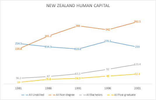 The only group in New Zealand that doesn’t have more human capital in 2001 than in 1981 were the unskilled as the chart above shows. This was because their numbers dropped by one-third as a share of the working age population.