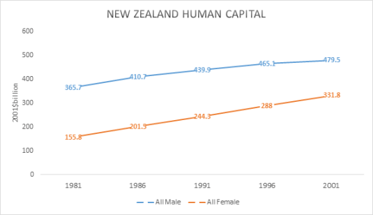 Source: Lˆe Thi. Vˆan Tr`ınh, Estimating the monetary value of the stock of human capital for New Zealand, University of Canterbury PhD thesis (September 2006), Table 4.8: Human and physical capital stocks.