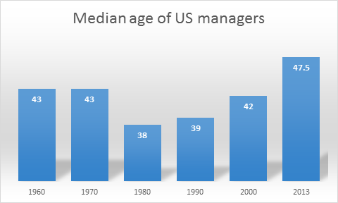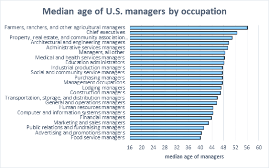 The average age of the US manager was 38 in 1980 and 39 in 1990. There is no US managerial occupation with an average age of less than 40 in 2013. The fifth managerial occupation with the lowest managing age is food service managers. The highest outside of agriculture is chief executives,