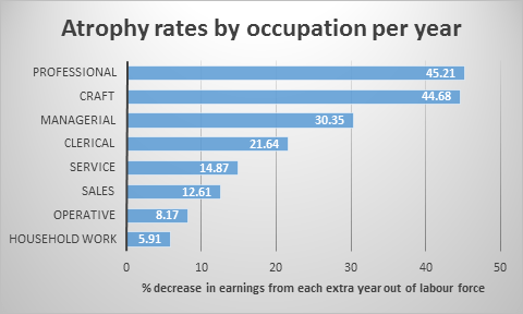 Thus, skill-specific atrophy during employment leave and the speed of skill repair upon returning to the labour market are shown to be important factors underpinning women’s occupational outcomes. This research suggests that a substantial portion of female occupational sorting could be determined by skill-specific atrophy-repair characteristics.