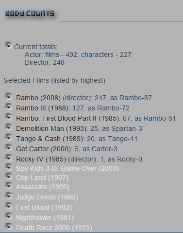 Did any of these people who count up kills by screen actors watch Rambo II? Two friends of mine allocating five kills per hut blown up easily got to 160 kills by Sylvester Stallone in huts alone. 267 is not enough.