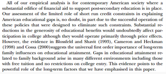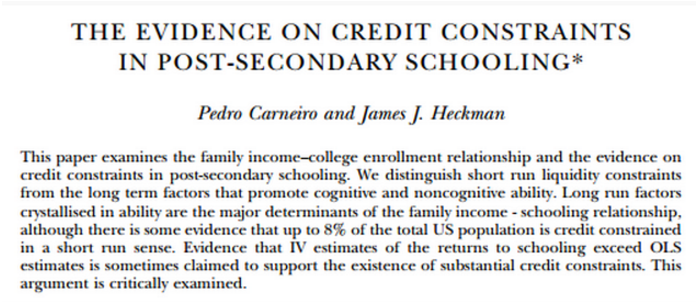 In 2002, with Pedro Carneiro, James Heckman showed that lack of access to credit is not a major constraint on the ability of young Americans to attend college. Short-term factors such as the ability to borrow to fund higher education has been found to be seriously wanting as an explanation for who and who does not go on to higher education. This has great relevance to New Zealand because the levels of student debt in the USA are much higher than here.