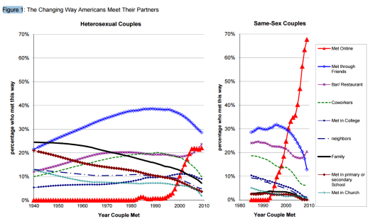 Here is the original data on how straight and gay couples meet. The BBC incorrectly coded their replotting of data to mix family with college.