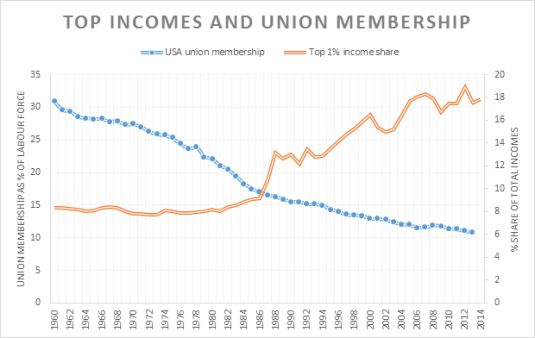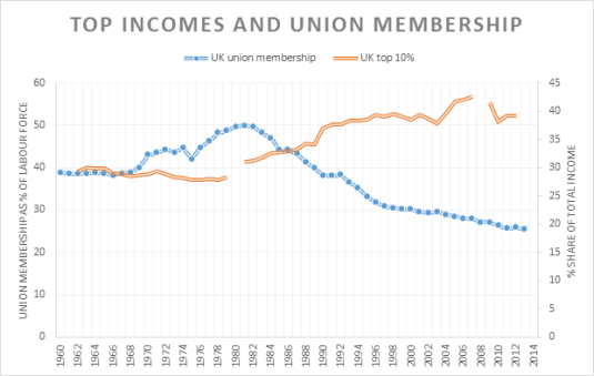 The Left in the USA and the UK like to show correlations between top incomes and the decline of union membership.