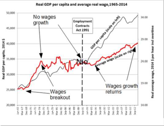 His employer, the Council of Trade Unions when it was denouncing the Employment Contracts Act 1991 as the reason for low wages growth has also drawn attention to the early 1990s as a turning point in the relationship between inequality, union bargaining power and wages growth.