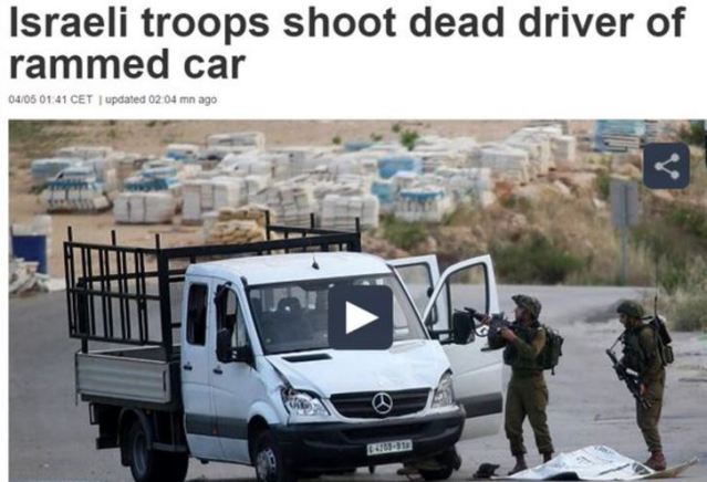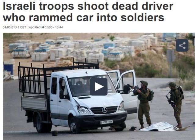 The extaordinarily confusing headline obscures the fact that a Palestinian terrorist rammed his car into several soldiers at a West Bank checkpoint, critically injuring one of them. Other soldiers then shot and killed the driver terrorist.