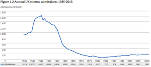 As you can see in the admissions to cinema from 1935-2013 you can see overall the admissions number has decreased from it’s highest of 1,600 million in 1945 to it’s lowest of 70 million in 1980-1985. It has steadied off at approximately 200 million admissions. the spike may have been caused by the fact in 1940-1945 cinema was the only media that was aired and televisions were not really used or had due to expense. As the use of televisions increased the use of cinema and admissions started declining which led to the huge drop from the spike. It declined so much as companies went bust in 1980’s which led to the huge drop in admissions as can be seen and since the number has levelled off. This number probability won’t rise too much more due to the fact streaming is often done online and DVD’s and television offer the…