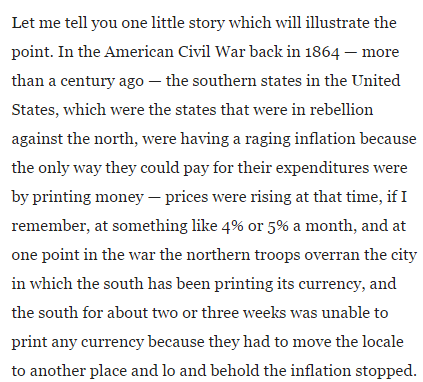 The usual Friedmanian argumentation, the roughest form of the quantity equation of money. No matter how many times I come across Friedman and no matter how much I do not agree with him, I am always surprised by his consistent reasoning. Nice quotation!