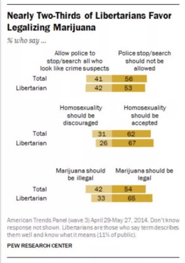 1/3rd of libertarians do not understand that to be a libertarian means you have to have rather liberal views on marijuana decriminalisation but 1/3rd do not know this.