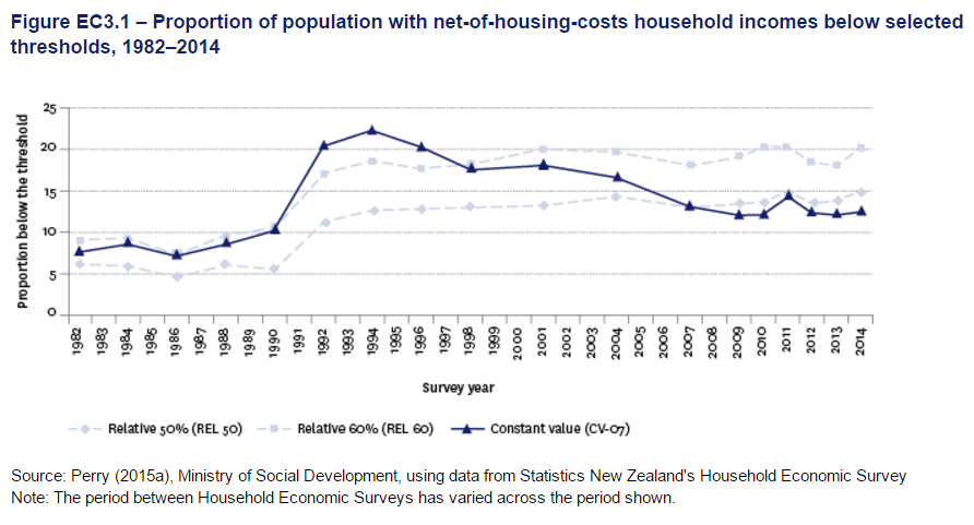 Source: Population with low incomes: The Social Report 2016 – Te pūrongo oranga tangata.