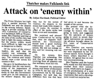 Like July 1981, October 1984 was a crisis point for Margaret Thatcher’s Conservative government. The miners’ strike was now six months in and Thatcher faced possible strike action by the pit deputies’ union, Nacods, which would have increased the severity of the strike. If Nacods had initiated strike action, many believe that Thatcher would not have been able to endure the effect that it would have on the British economy. In July 1984, Thatcher had addressed a private meeting of the 1922 Committee, a pressure group within the Conservative Party, and has referred to the miners as the ‘enemy within’. From papers released by the Margaret Thatcher Foundation this month, we now know that she was going to return to this theme at the Conservatives’ 1984 Party Conference, to be held in Brighton.