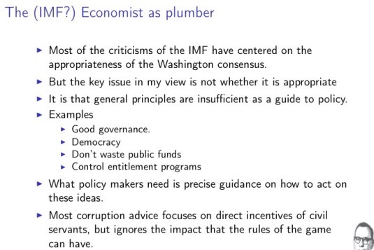 Earlier this month, Esther Duflo of MIT gave a talk at the IMF, and the slides are available here. I found the framing insightful.