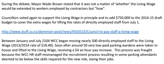 The report was my source for the Wellington Parking wardens not being rehired after their jobs were upgraded to a living wage job. The jobs were taken in house as a legal subterfuge to get around the inability to pay them the living wage when they are employed by Parkwise, a council contractor. The Local Government Act requires value for money to be secured if you pay more for a service.