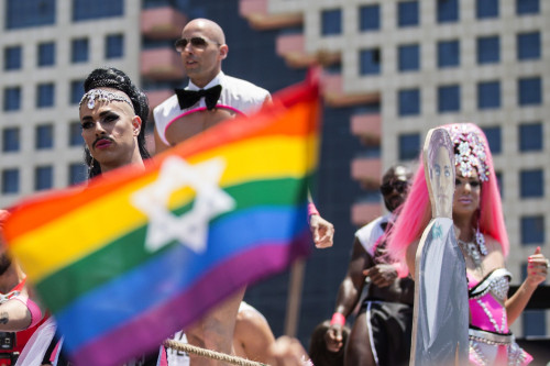 From both the left-wing Israel paper Haaretz and the Windy City Media Group, we get a disturbing report: at yesterday’s “Dyke March” in Chicago, a parade celebrating lesbian and LGBT pride and achievements, Jewish lesbians carrying the “Jewish pride” flag were asked to leave. Why? Because the flag “triggered” some of the participants, and apparently because some participants considered the march implicitly “anti-Zionist and pro-Palestinian”. Here, from Pink News, is what the Jewish Pride flag looks like. It’s basically the Gay Pride flag with a star of David on it, a symbol of Judaism. Note that it is not the Israeli flag. (These pictures are from the annual Gay Pride Parade in Tel Aviv; photos by Jack Guez):