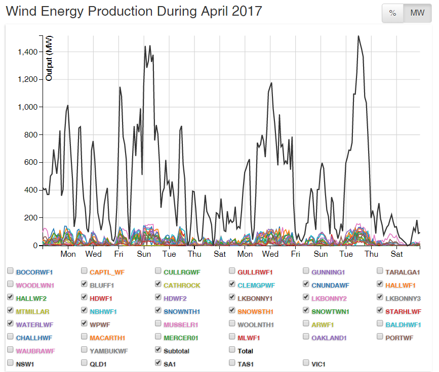 These days, it’s almost impossible to read an article about South Australia’s economic misfortunes in which there is no mention of routine load-shedding and mass blackouts – the result of total and totally unpredictable collapses in wind power output (see above and further below, the output for April, May, June, from every wind farm in SA with a notional capacity of 1,698MW, courtesy of Aneroid Energy).