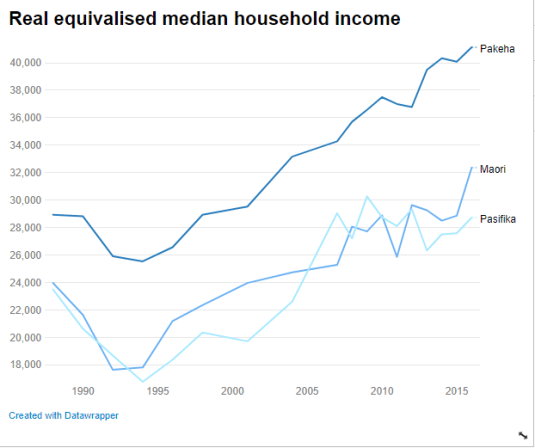 The figure below shows that since the end of the recession in the early 1990s, there has been rapid income growth including from Maori and Pacifika, at least 50%, if not 70%.