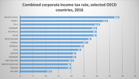 The US got away with a very much above average company tax rate (38%) because its economy is so large relative to the rest of the world but it too is under pressure from footloose capital and corporate inversions. The US company tax system is so full of holes that if all tax loopholes were closed, its federal company tax rate could be cut from 35% to 9% with no net loss of revenue.