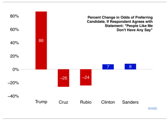 Feeling of powerlessness and voicelessness was a much better predictor of Trump support than age, race, college attainment, income, attitudes towards Muslims, illegal immigrants, or Hispanic identity