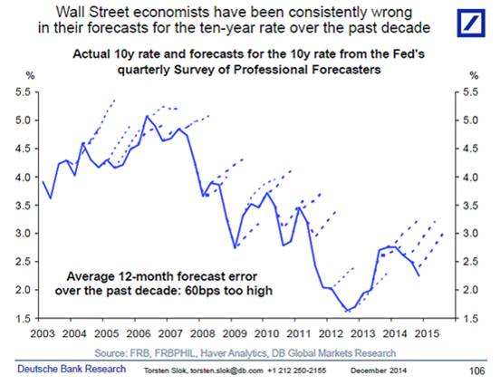 An important chart ran in University of Chicago scholar John Cochrane’s blog recently, and it revealed that at any point in time Wall Street economists predict interest rates will go higher, almost certainly a reflection of inflation fears.