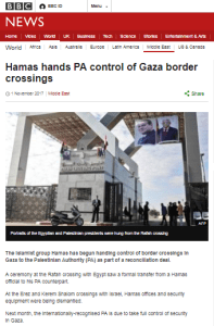 The transfer of control of the crossings in and out of the Gaza Strip was the topic of an article published on the BBC News website’s Middle East page on November 1st under the headline “Hamas hands PA control of Gaza border crossings“.