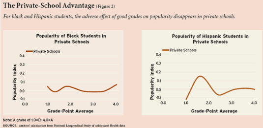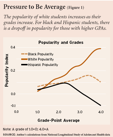 But Fryer also found that “In predominantly black schools, I find no evidence at all that getting good grades adversely affects students’ popularity”