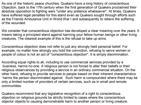 Quakers would be most upset if there was no conscientious objection provisions from military service but they will not grant the right to hold foolish moral and religious views to reactionary religions over same-sex marriage.
