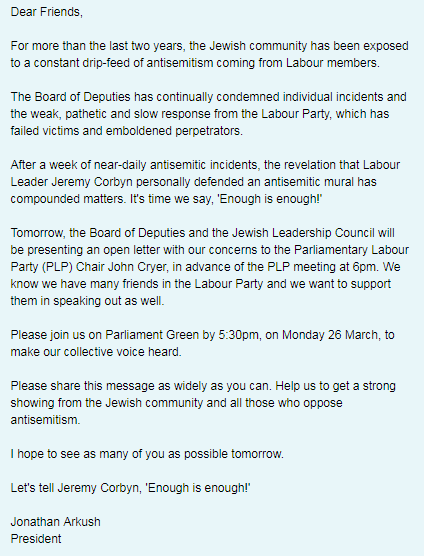 On the evening of March 25th the Board of Deputies of British Jews and the JLC put out an unprecedented letter criticising the leader of the British Labour Party and calling for a protest outside Parliament the following day.