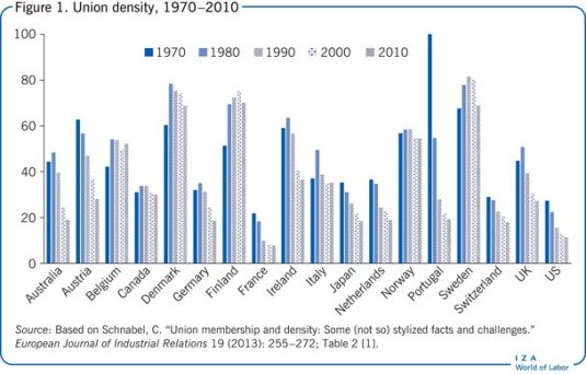 Union density is in retreat. Data for 25 advanced countries indicate that union density has fallen in 24 out of 25 countries over the last 20 years, and in 23 out of 24 countries in the last 30 years https://t.co/T1LVP2e8nT pic.twitter.com/LLVXRb65C2