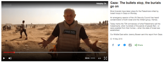 A filmed report by the BBC’s Middle East editor Jeremy Bowen which was aired on BBC One’s ‘News at Ten’ and on the BBC News Channel on May 16th was also posted on the BBC News website under the headline “Gaza: The bullets stop, the burials go on“.