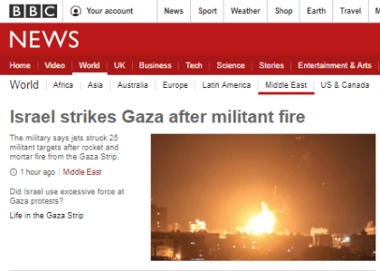 In typical ‘last-first’ style, the headline to the BBC News website’s report on that story read “Israeli jets strike Gaza after rocket and mortar fire” and the euphemism ‘militants’ was seen again.