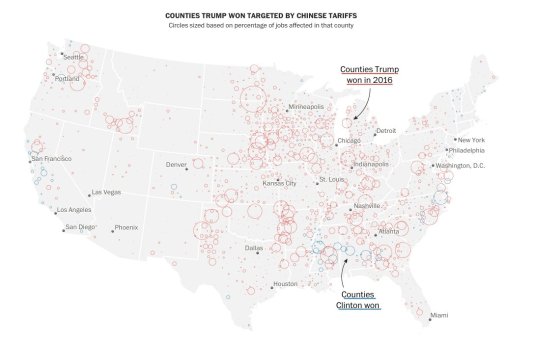 Jobs exposed to Chinese tariffs are more than twice as likely to fall in counties that voted for Donald Trump in 2016 than in counties won by Hillary Clinton, an analysis shows https://t.co/gMdoHEdSFu pic.twitter.com/XcPuHzb2C9