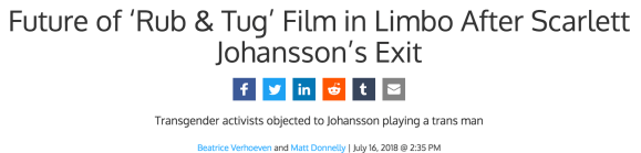 As I reported the other day, Scarlett Johansson was set to star in a movie called “Rub & Tug”, recounting the life of Dante “Tex” Gill, a transgender man who transitioned at a late age, and then was jailed for tax evasion after having run a string of massage parlors that were fronts for prostitution. After an outcry from the transgender community, Johansson apologized and withdrew from the movie. Now, as many predicted, the movie’s future is dicey because its big bankable star is gone. Click on the screenshot below to read about it in The Wrap.
