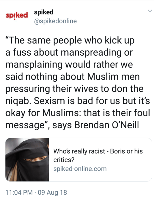 “The same people who kick up a fuss about manspreading or mansplaining would rather we said nothing about Muslim men pressuring their wives to don the niqab. Sexism is bad for us but it’s okay for Muslims: that is their foul message”, says Brendan O’Neill https://t.co/uEha2PSHlo