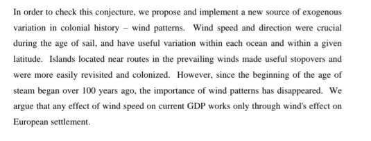 They argue that the nature of discovery and colonization of islands provides random variation in the length and type of colonial experience. They instrument for length of colonization using variation in prevailing wind patterns and direction.