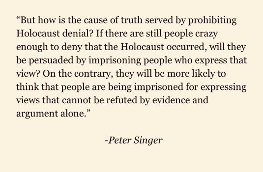 Three of Peter Singer's grandparents died in the Holocaust. This is Singer's view on criminalizing Holocaust denial: pic.twitter.com/cIeP0CqgCK