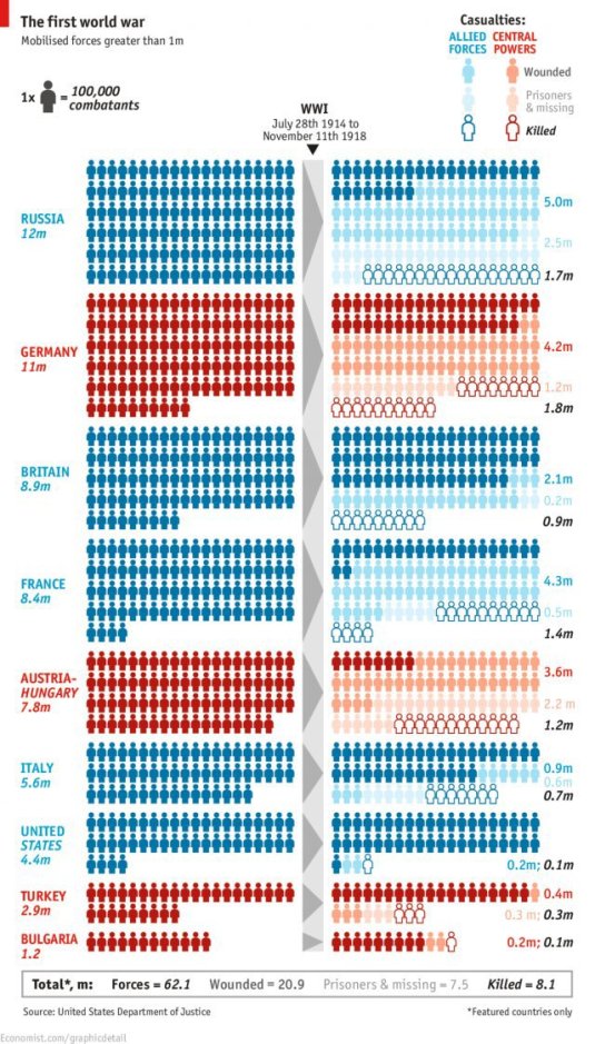 This is an excellent chart illustrating the number of casualties that the major war participants suffered during #WW1. Courtesy of @TheEconomist. #ArmisticeDay100 pic.twitter.com/QxD6DbpABn