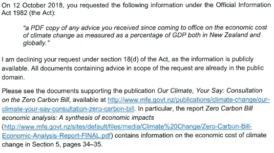 I drew a blank when I asked a year ago whether the minister for climate change knew the cost of global warming to the New Zealand economy as a percentage of GDP. After one year, the sum total of his knowledge of the cost of global warming as a percentage of GDP is a passing reference in the Zero-Carbon Bill consultation documents.
