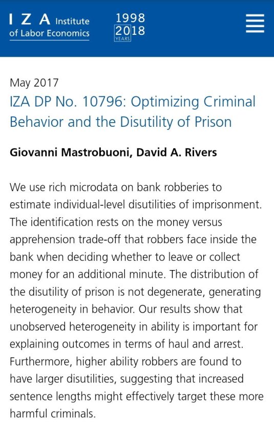 High ability robbers (e.g. remembers to have a gun, mask, getaway car) stay long in banks & are deterred by longer sentences @sst_nz